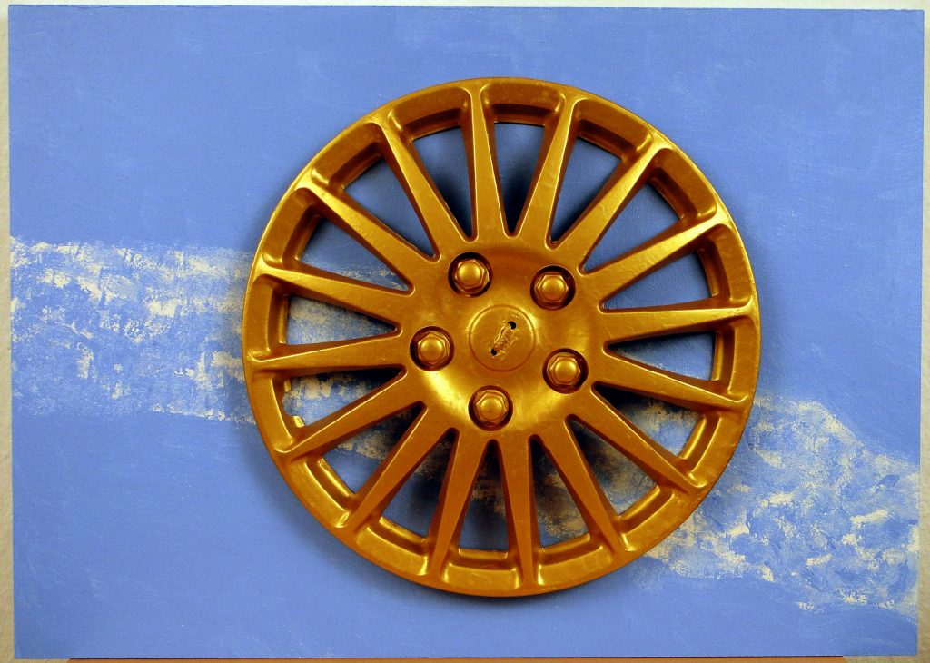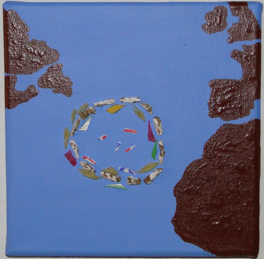 Materials: plastic trash found on the beach with acrylic paint on canvas.